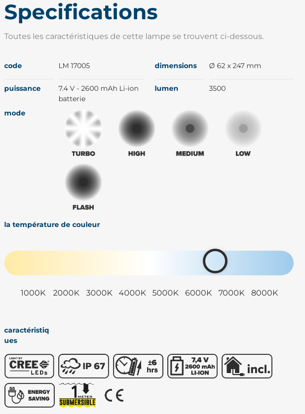 Ne paniquez pas lorsque votre lampe tombe dans l’eau. Elle est étanche jusqu’à 1 mètre de profondeur. L’utilisation sous la pluie ne pose également aucun problème.